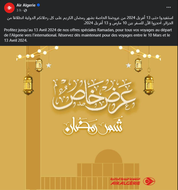 وقالت الجوية الجزائرية. على صفحتها الرسمية بـ “فايسبوك”: “استفيدوا حتى 13 أفريل 2024. من عروضنا الخاصة بشهر رمضان الكريم، على كل رحلاتكم الدولية انطلاقا من الجزائر”.