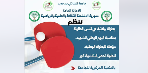 في إطار النشاطات الرياضية الجامعية وبمناسبة إحياء اليوم الوطني للشهيد تنظم المديرية الفرعية للأنشطة الثقافية والعلمية والرياضية لجامعة الشاذلي بن جديد بطولة ولائية في تنس الطاولة أمسية هذا الخميس 16فيفري2023 ، حيث ستكون البطولة مفتوحة لجميع طلبة جامعة الشاذلي بن جديد إناث وذكور من أجل التنافس على المراتب الأولى ، والتي سيتأهل من خلالها الفائزين المتحصلين على المراتب الاولى لتمثيل الجامعة في البطولة الوطنية.