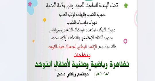 يحتضن هذا الخميس 01 جوان 2023 المركب المتعدد الرياضات إمام الياس بالمدية التظاهرة الرياضية الوطنية لأطفال التوحد، والتي ستنظمها مديرية الشباب والرياضة لولاية المدية بالتنسيق مع مديرية النشاط الاجتماعي والتضامن و الاتحاد الوطني لجمعيات طيف التوحد وبمساهمة كل من ديوان مؤسسات الشباب ، ديوان المركب المتعدد الرياضات إمام الياس ،جمعية الزهرة التضامن مع أطفال التوحد ، وبتأطير من الرابطة الولائية للرياضة للجميع ، حيث من المنتظر مشاركة21 ولاية من الوطن في أربعة اختصاصات رياضية