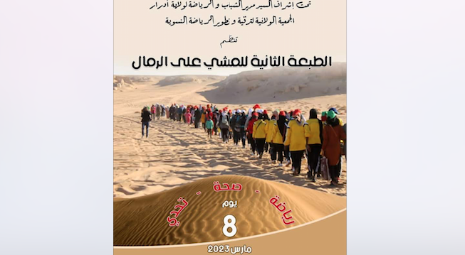 سيتم هذا الأربعاء 08مارس بقصر تامسخت ولاية أدرار وبمناسبة اليوم العالمي للمرأة تنظيم الطبعة الثانية للمشي على الرمال للنساء من تنظيم الجمعية الولائية لترقية وتطوير الرياضة النسوية والتي ستكون تنظيم هذه الطبعة الثانية تحت رعاية والي ولاية أدرار وبإشراف مديرية الشباب والرياضة للولاية.