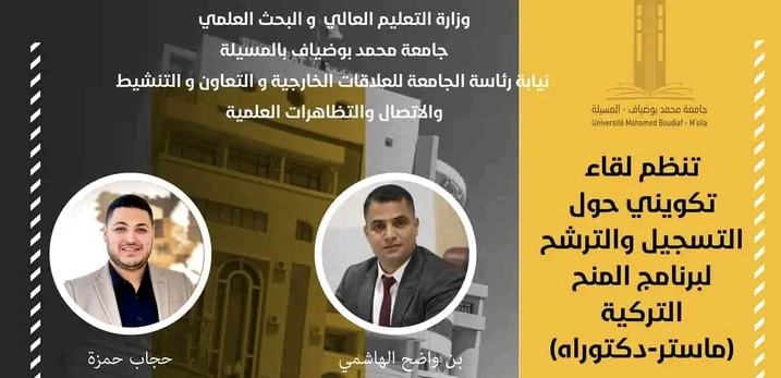 اعلنت جامعة محمد بوضياف بالمسيلة، عن تنظيم يوم تعريفي حول كيفيات الترشح للمنح الدراسية في الجامعات التركية، وحدد يوم الثلاثاء الثاني عشر من ديسمبر يوماً لهذا الحدث، وسيشارك طلبة ليسانس وذلك لتحضير الماستر، إضافة لطلبة الماستر تحضيرا للدكتوراه، وذلك بحضور نائب مدير الجامعة للعلاقات الخارجية البروفيسور الهاشمي بن واضح، بمعية طالب الدكتوراء بجامعة اسطنبول حمزة حجاب، كما افادت الجامعة انها فتحت منصة للطلبة الراغبين في حضور اللقاء التكويني، كما أكدت على ضرورة التسجيل والترشح .